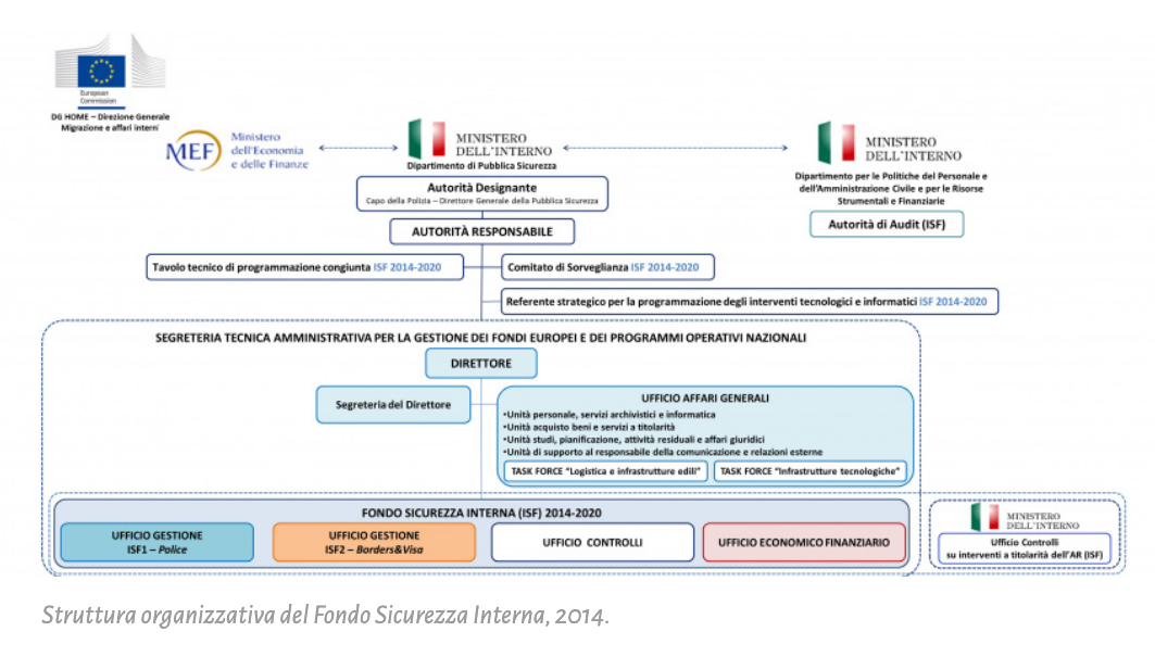 Il programma nazionale dei finanziamenti italiano è stato approvato nel 2015 dalla Commissione europea (Decisione della Commissione Europea sul programma nazionale ISF in Italia dal 2014 al 2020, agosto 2015), con un budget relativo di 244.888.658 euro da utilizzare nell’arco di 6 anni. In numerosi progetti è prevista una doppia natura di finanziamento, in parte europea e in parte nazionale.